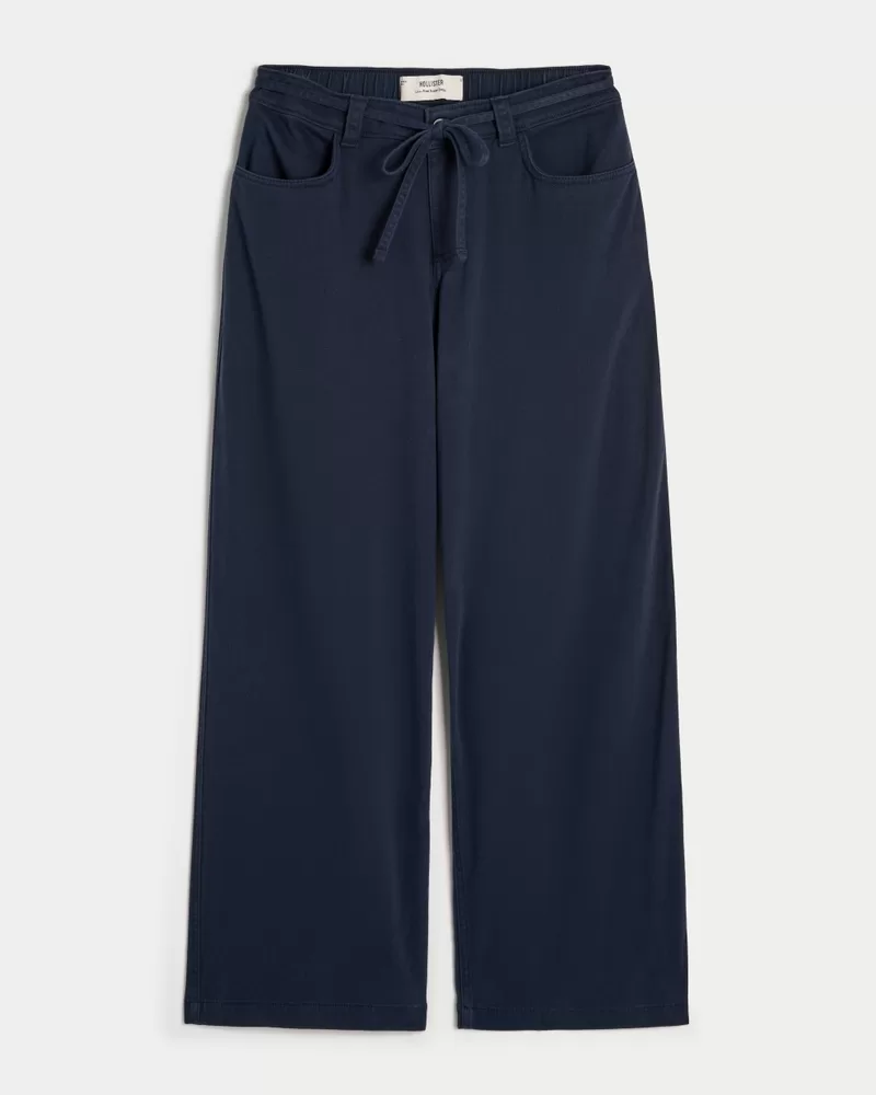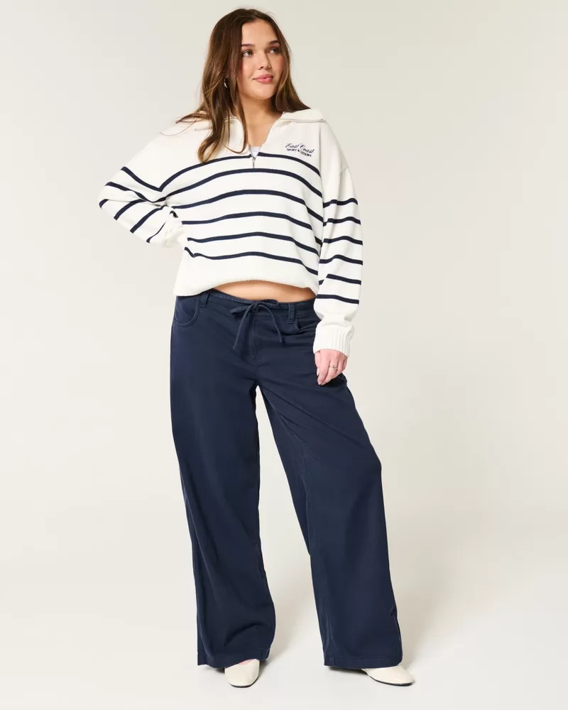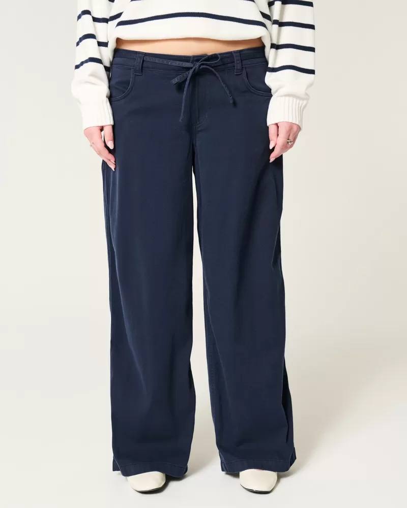 Soft twill pants designed with a flattering low-rise drawstring waist. Zipper closure, pockets, super baggy leg.