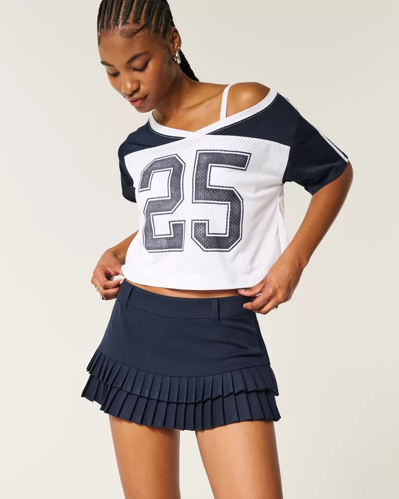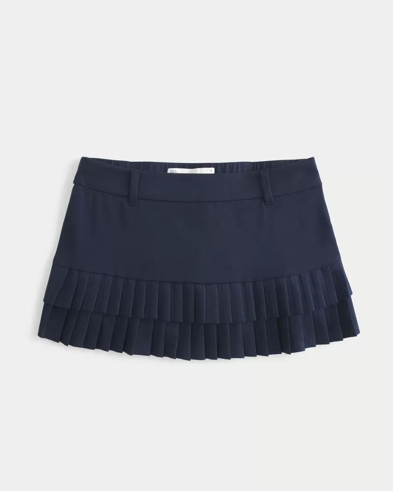 A cute mini skort with a micro-pleated hem and hidden knit shorts. Belt loops, low-rise waist. Imported.