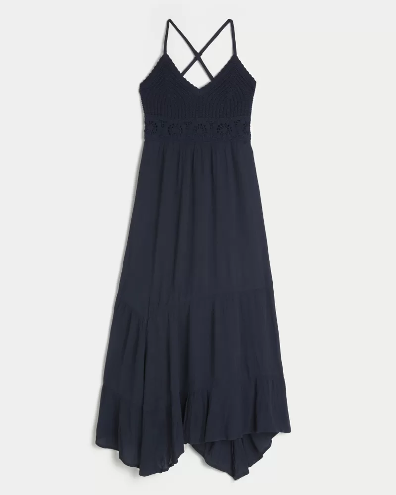 Flowy and super soft, this maxi-length dress features mixed fabrics with crochet-style patterns and a woven skirt. Asymmetrical hem, cross-back straps.