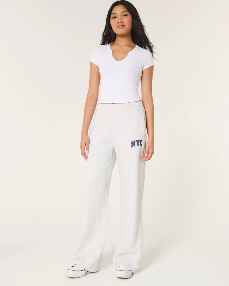 Super soft fleece pants an NYC print graphic, soft banded waist and pockets. Wide-leg pants.