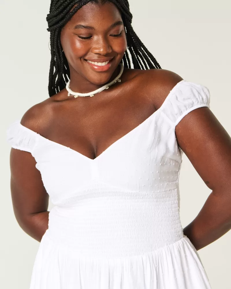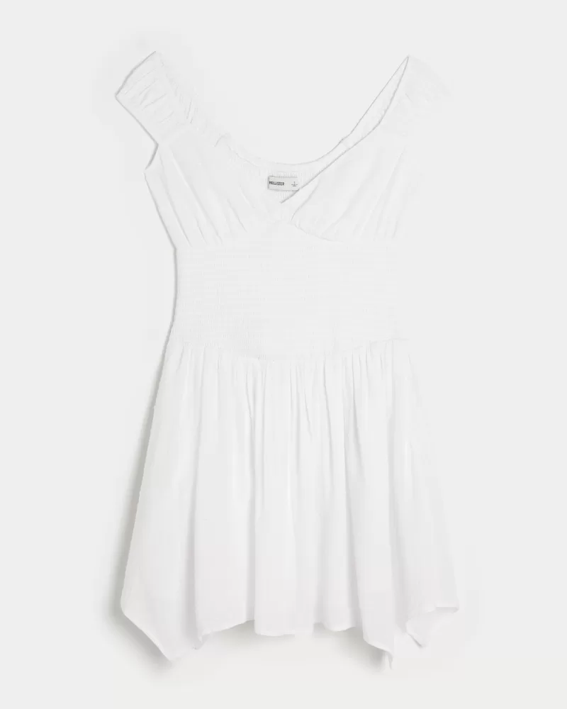 Pretty and super soft, this mini dress has an asymmetrical hem and off-the-shoulder cap sleeves. Soft smocked waist, pockets.