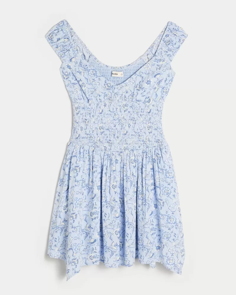 Super soft and pretty, this off-the-shoulder mini dress features pockets and a smocked waist. Asymmetrical hem.