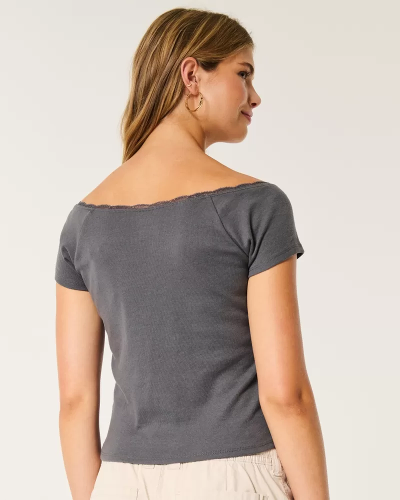 Cute and super soft, this top features an off-the-shoulder v-neckline with lace trim and a center bow detail. Short sleeves. Slim Fit.