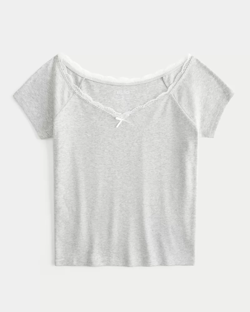 Cute and super soft, this top features an off-the-shoulder v-neckline with lace trim and a center bow detail. Short sleeves. Slim Fit.