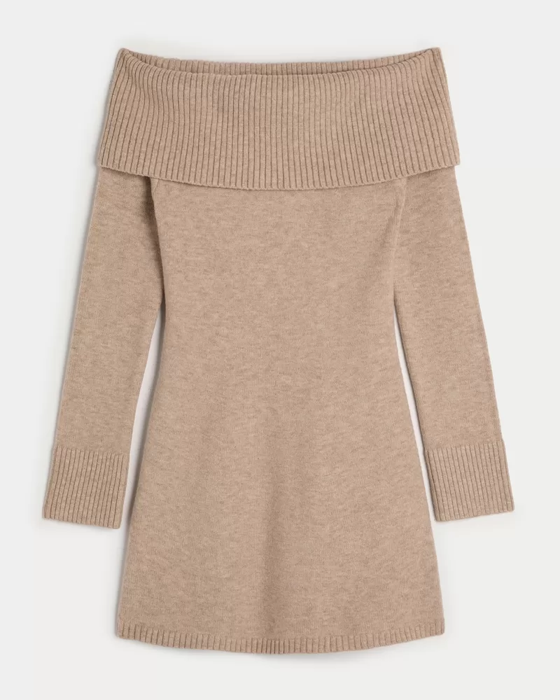 This cute, comfy and super soft sweater dress is designed with a foldover off-the-shoulder neckline and long sleeves. Skater silhouette.