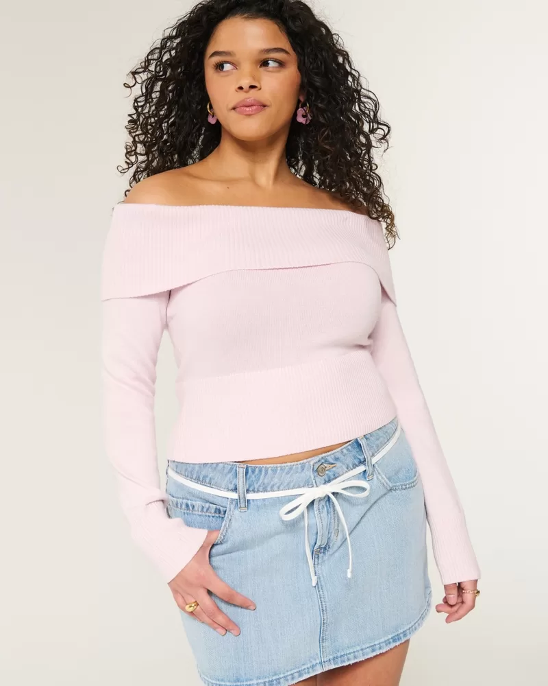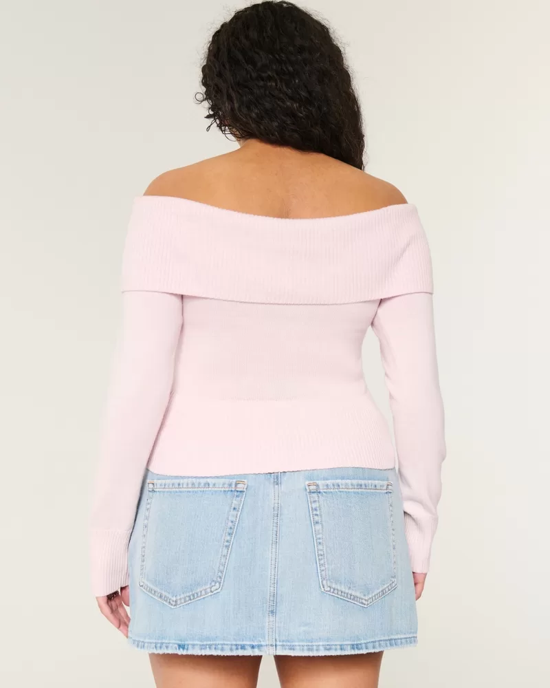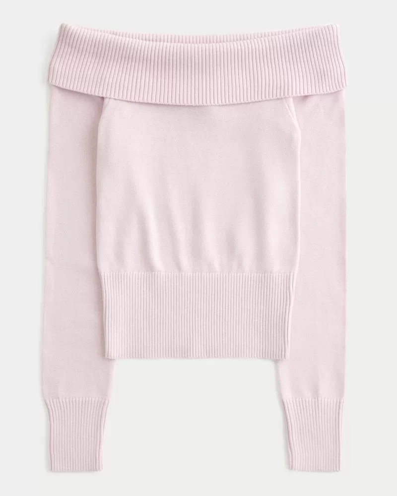 A cozy and super soft sweater in a stretchy cotton blend. Foldover off-the-shoulder neckline, long sleeves, ribbed trims. Slim Fit.
