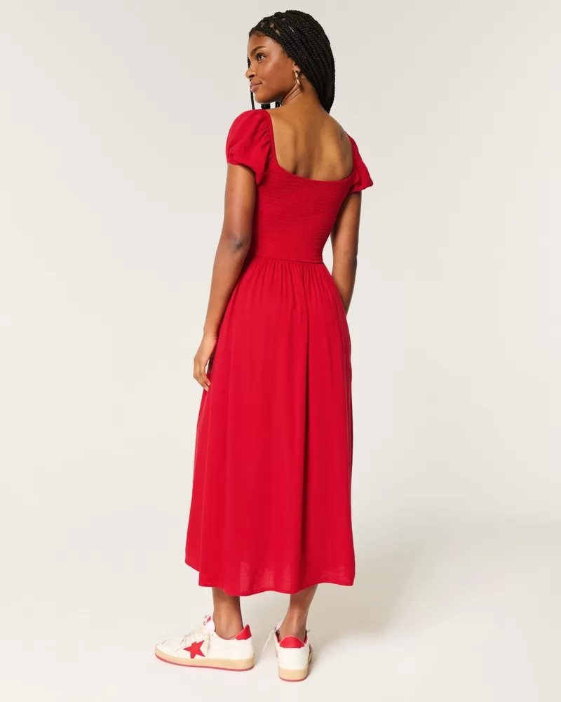 A cute and comfy longer-length dress with a split hem detail and short puff sleeves. Twist detail at the bust, pockets. Relaxed neckline can be worn on or off the shoulders.