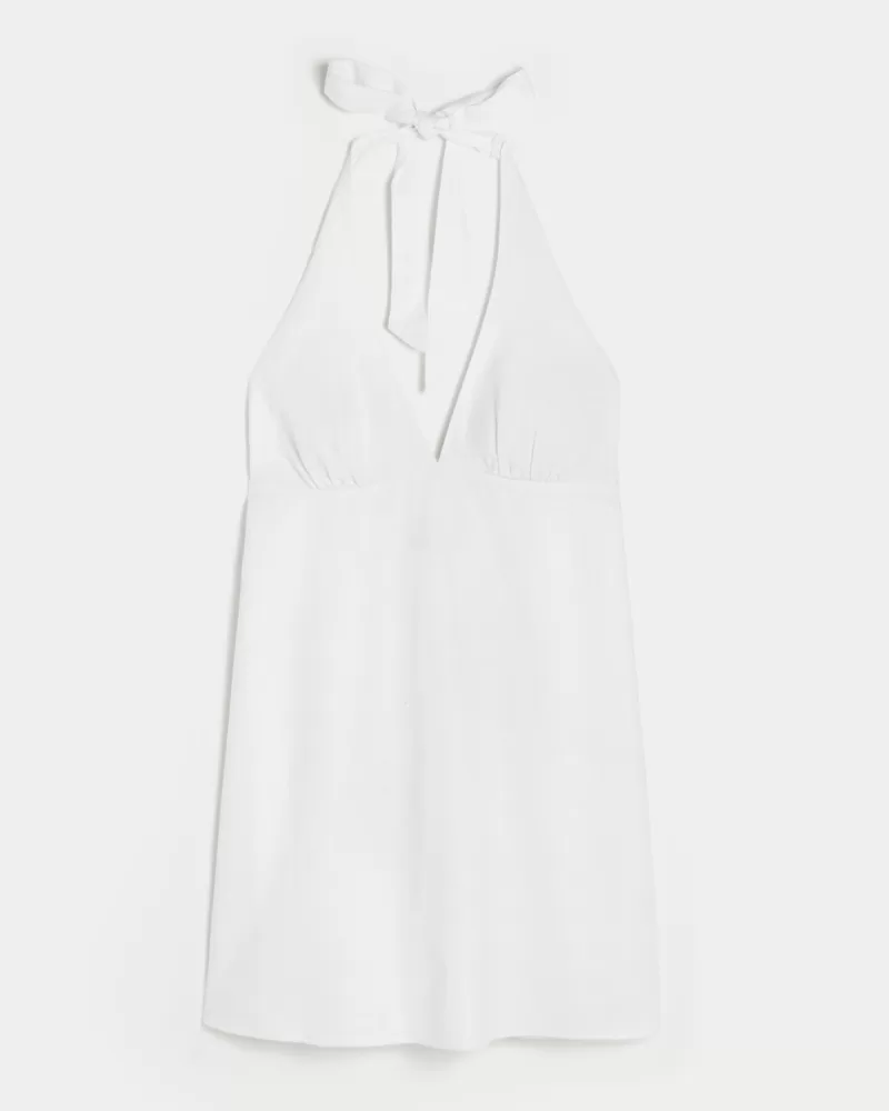 Flowy and super soft, this linen-blend dress features halter straps and an open back detail. Mini length.