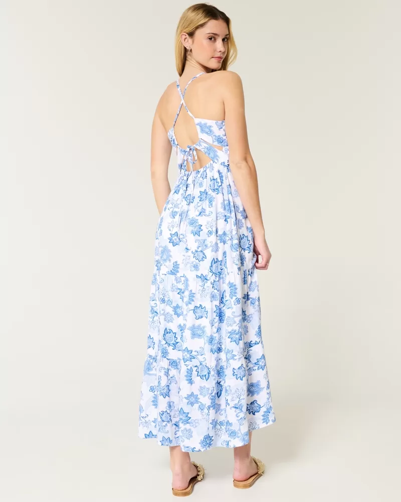 A pretty and super soft maxi-length dress with cross-back straps and an open back detail. Split hem detail.
