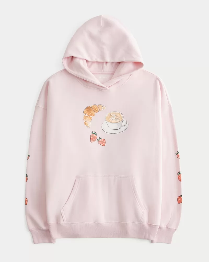 A super soft and ultra-comfortable fleece hoodie featuring cute café-inspired print graphics. Hood, front pouch pocket, long sleeves. Oversized Fit.