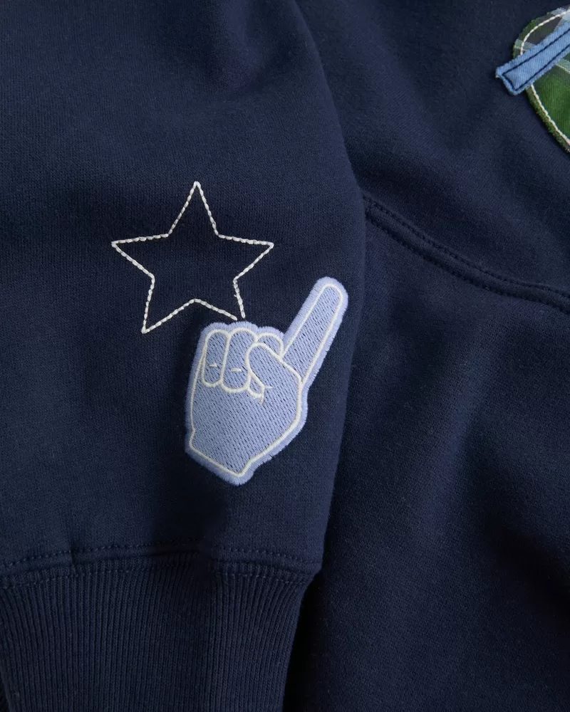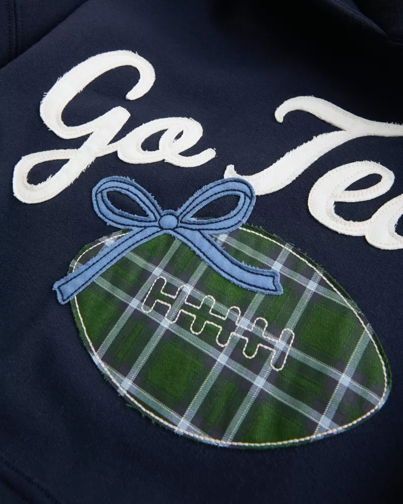 Cozy and super soft, this fleece hoodie features Go Team graphic embroidery and applique. Hood, front pouch pocket, long sleeves. Oversized Fit.
