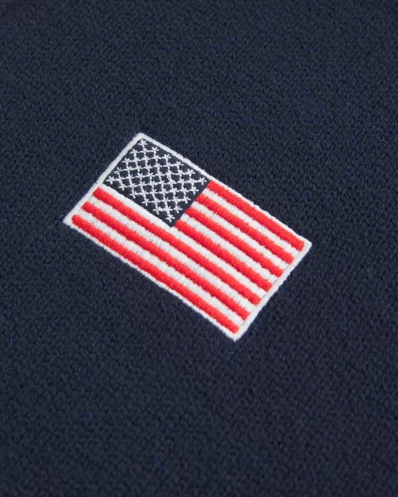 A cozy and super soft sweater with a foldover collar and half-zip closure. Ribbed trims, long sleeves, embroidered American Flag graphic embroidery at the left chest. Oversized Fit.
