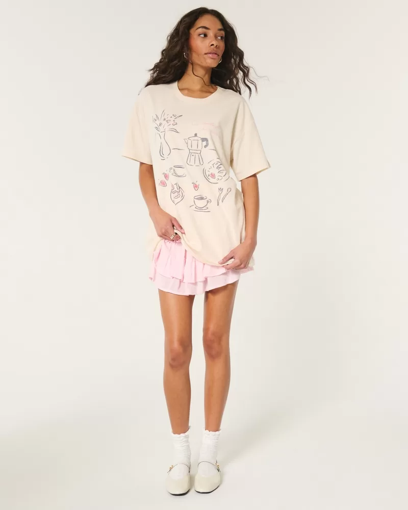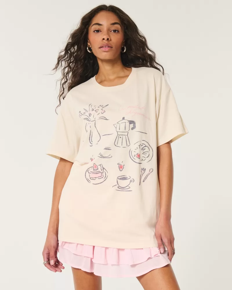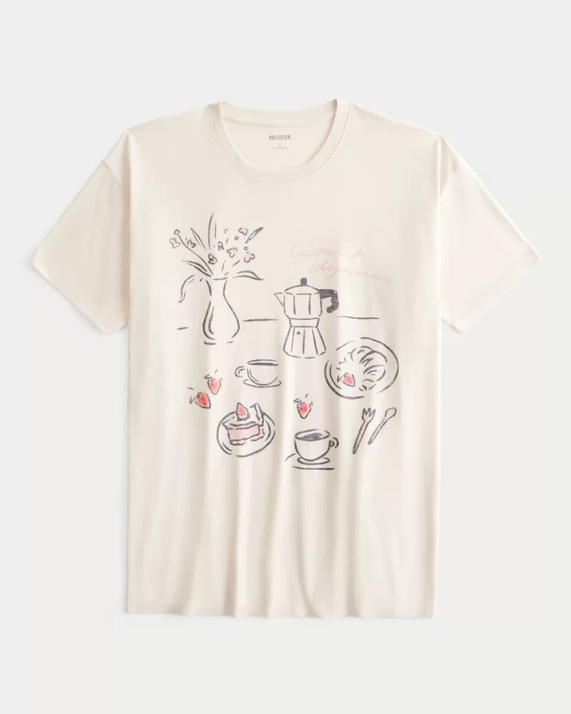 This super soft tee features le petit déjeuner print graphics. Crew neckline, short sleeves. Oversized Fit. Imported.