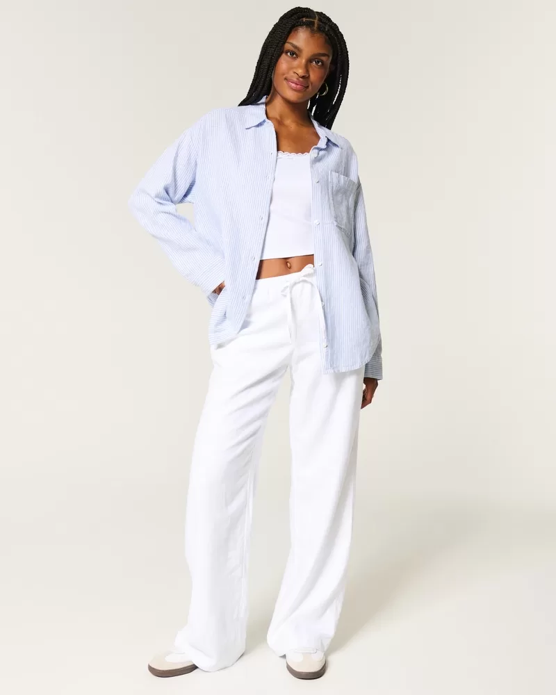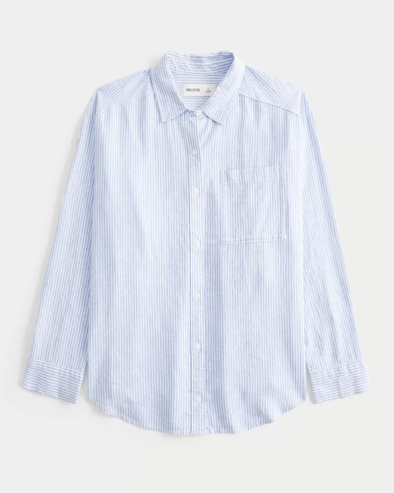 Your new fave shirt is made with a soft linen blend and is designed with a full button closure and left chest pocket. Curved hem, collar. Oversized Fit.