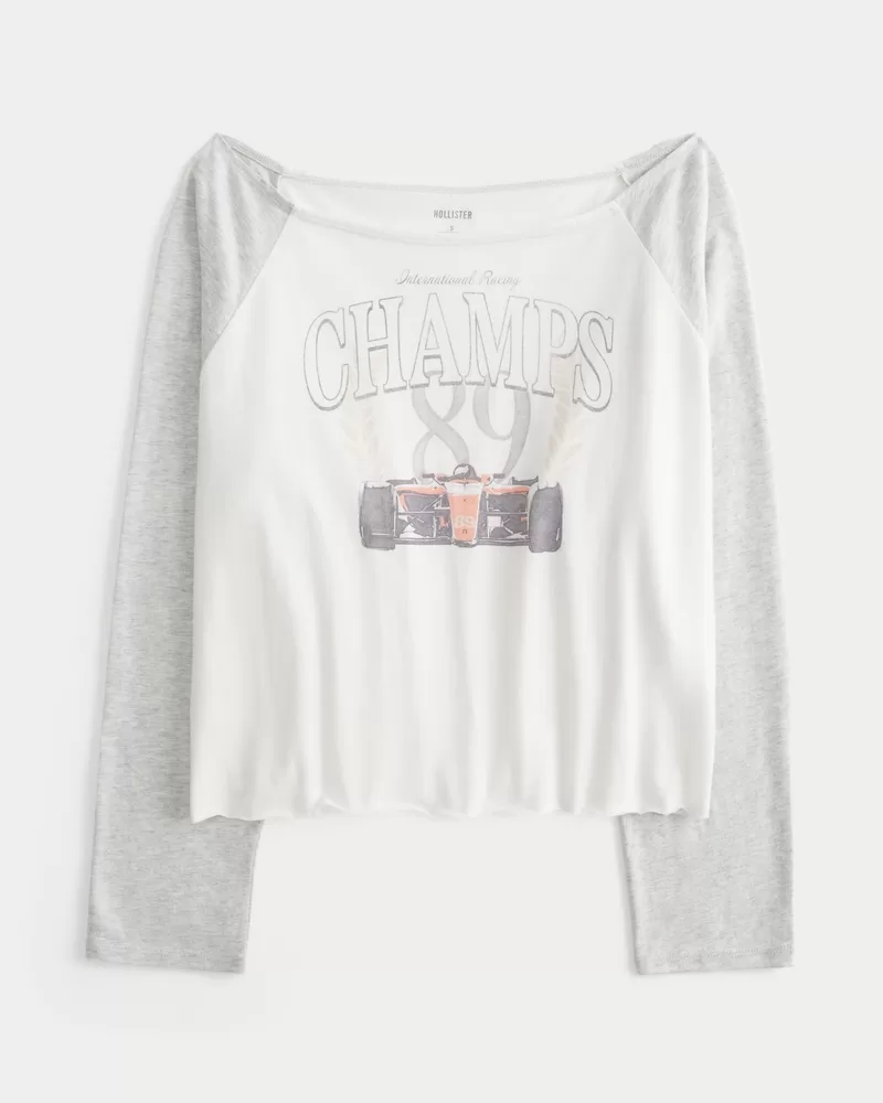 A super soft 100% cotton tee featuring racing print graphics and slouchy off-the-shoulder neckline. Long raglan sleeves. Oversized Fit.