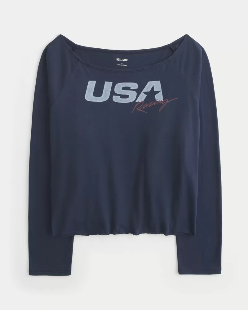 A super soft 100% cotton tee featuring USA Racing print graphics and slouchy off-the-shoulder neckline. Long sleeves. Oversized Fit.