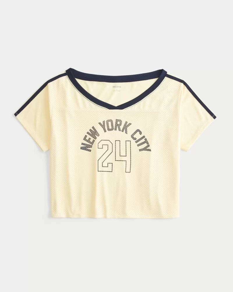 A soft mesh jersey-style top with an off-the-shoulder v-neckline and New York City print graphic. Short sleeves. Oversized Fit.