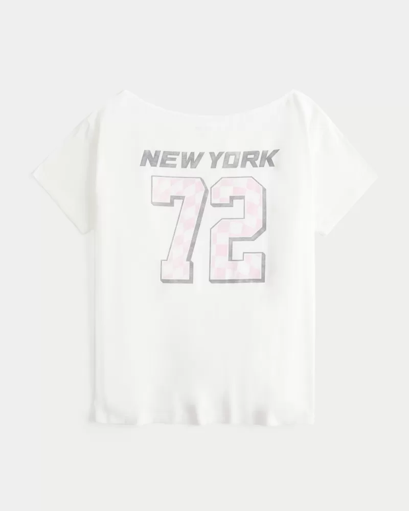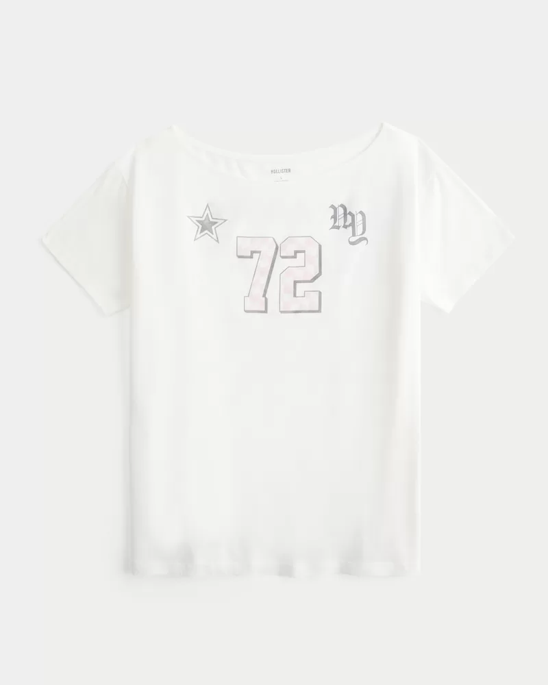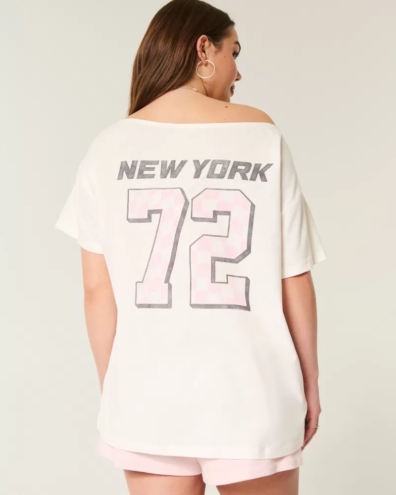 This super soft 100% cotton tee features a number print graphic and off-the-shoulder neckline. Short sleeves, longer length. Oversized Fit.
