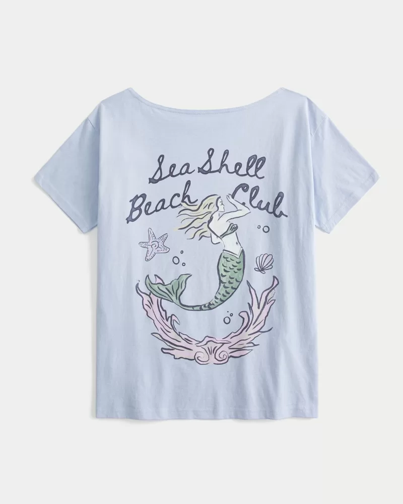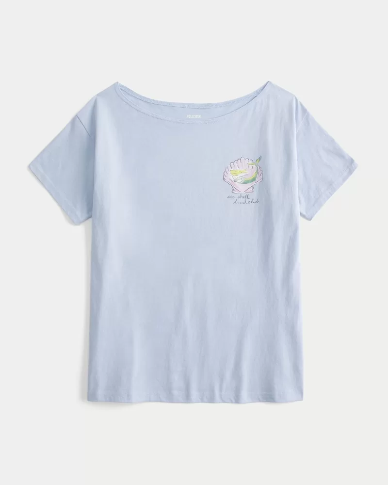 Oversized Off-the-Shoulder Sea Shell Beach Club Graphic Tee