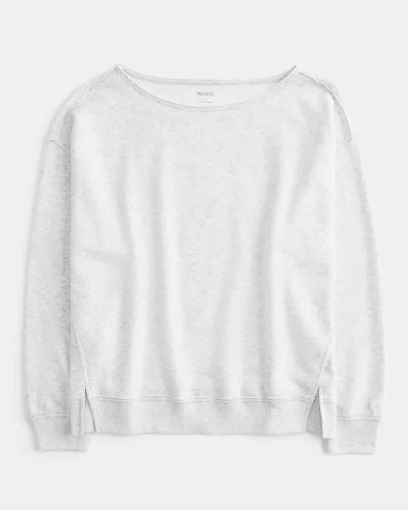 A cute and comfy sweatshirt in super soft fleece fabric, designed with a relaxed neckline that can be worn off the shoulders. Split hem details, long sleeves. Oversized Fit. Imported.
