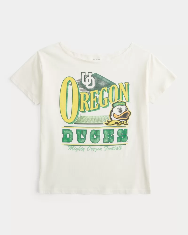 A super soft and comfy tee with an off-the-shoulder neckline and official licensed University of Oregon Ducks print graphics. Short sleeves. Oversized Fit.