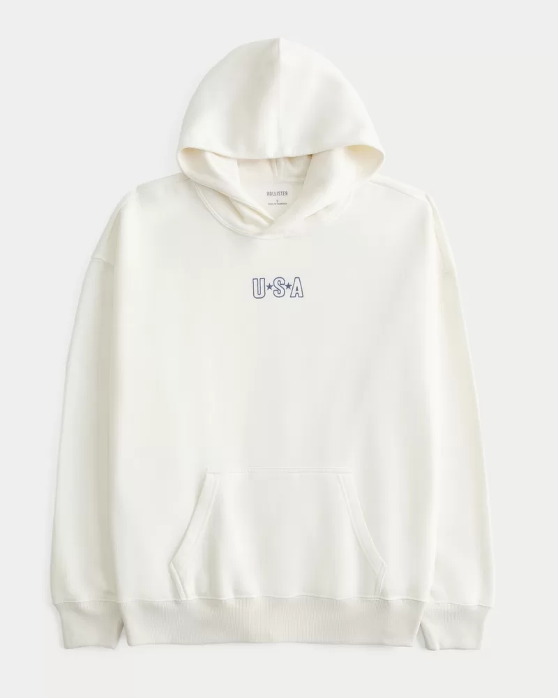 A super soft fleece hoodie with an embroidered USA graphic, hood and front pouch pocket. Long sleeves. Oversized Fit.