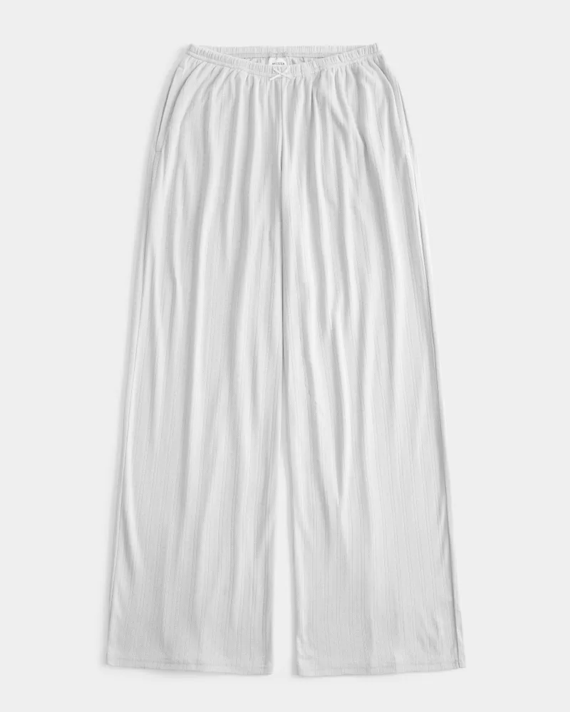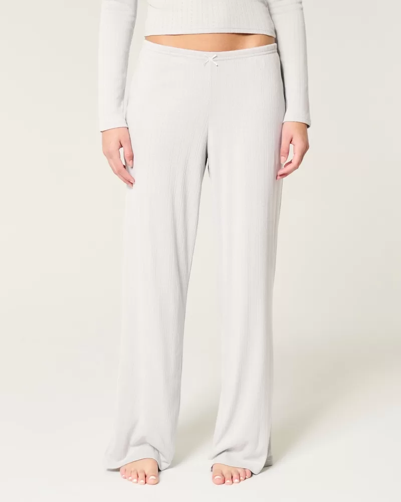 Cozy and super soft pajama pants with a banded adjustable-rise waist and pockets. Pointelle fabric, cute bow detail at center waist, wide-leg silhouette.