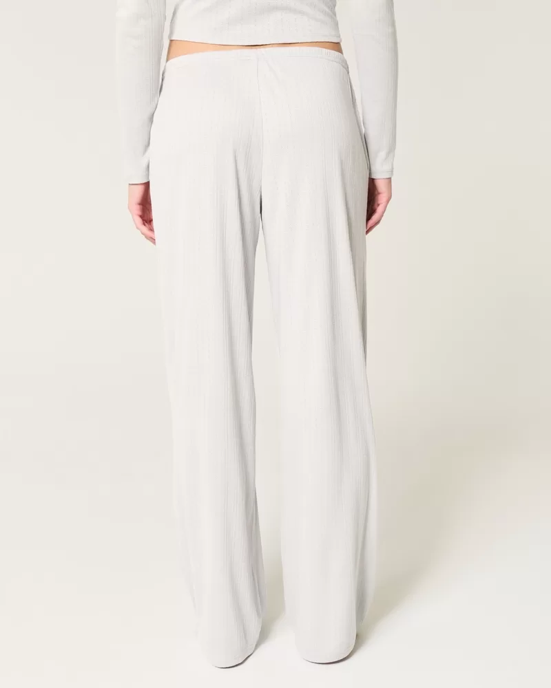 Cozy and super soft pajama pants with a banded adjustable-rise waist and pockets. Pointelle fabric, cute bow detail at center waist, wide-leg silhouette. Imported.
