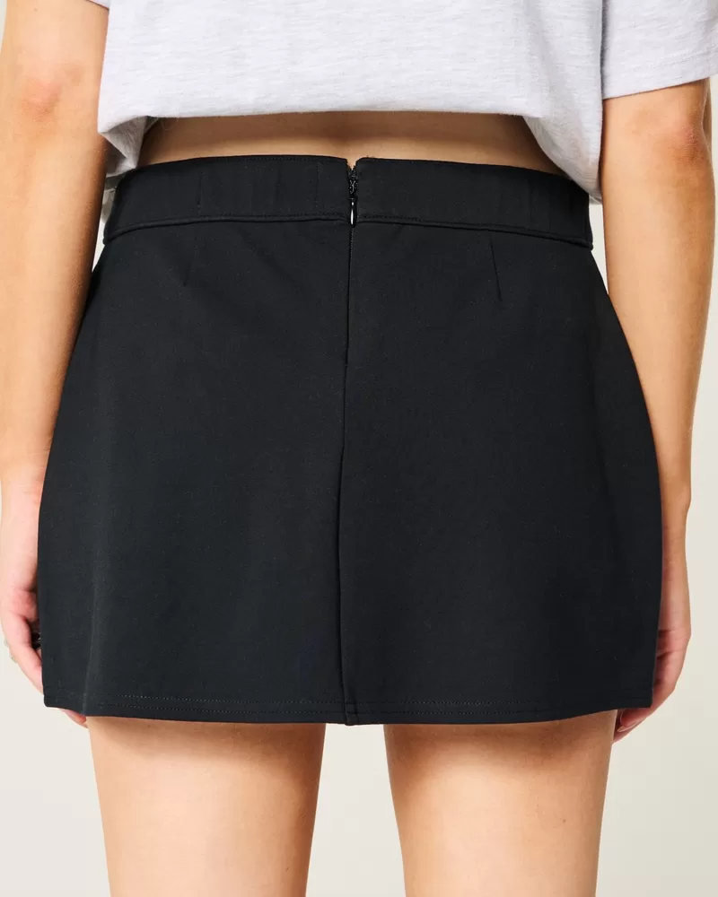 This super cute mini skort features hidden knit shorts, a center back zipper and hem notch detail. Soft ponte fabric, a-line silhouette, high-rise waist. Imported.