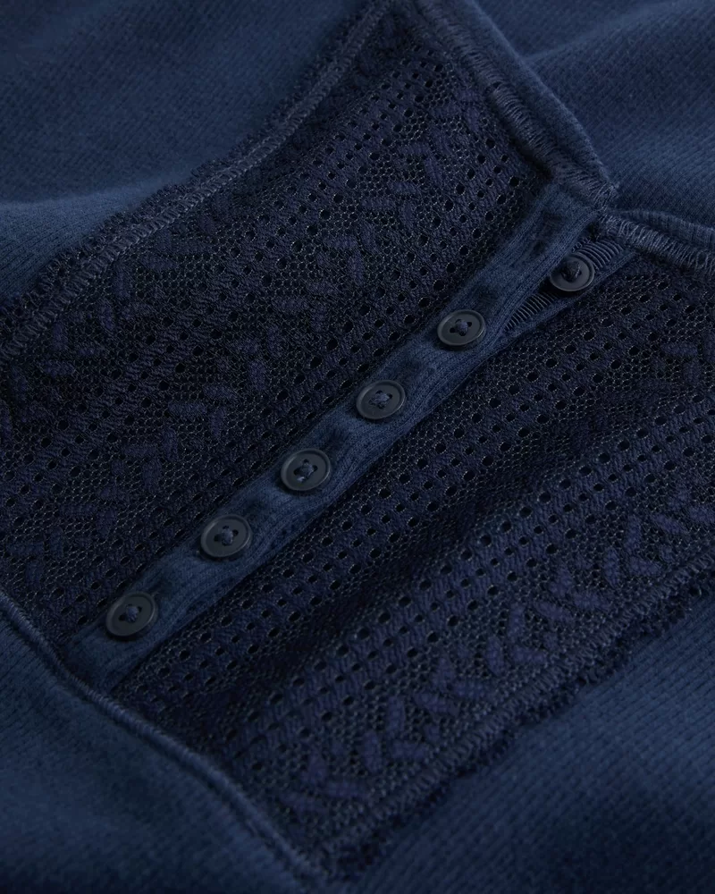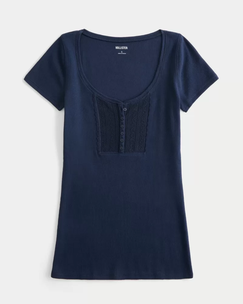 A cozy henley in super soft ribbed fabric featuring a scoop neckline and button placket with pretty lace detailing. Short sleeves. Slim Fit.