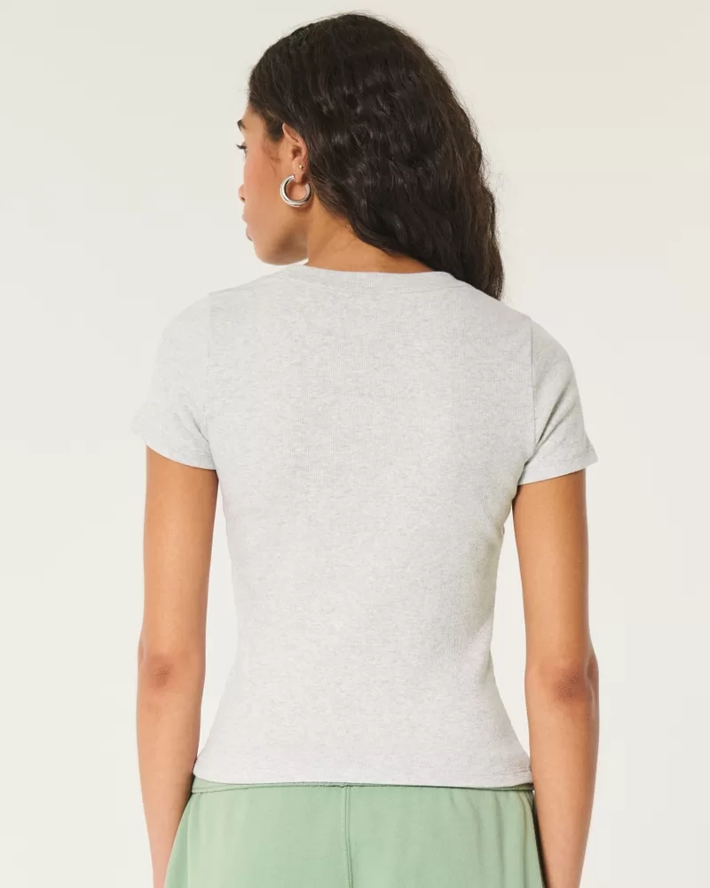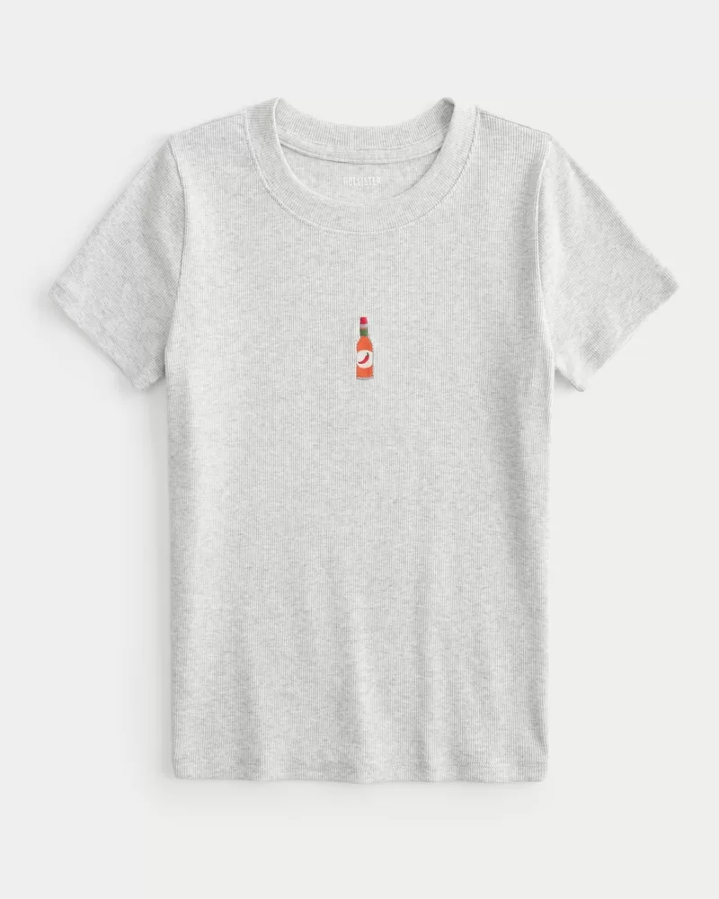 A cute and cozy baby tee in super soft ribbed fabric featuring an embroidered hot sauce graphic, crew neckline and short sleeves. Longer length. Slim Fit.