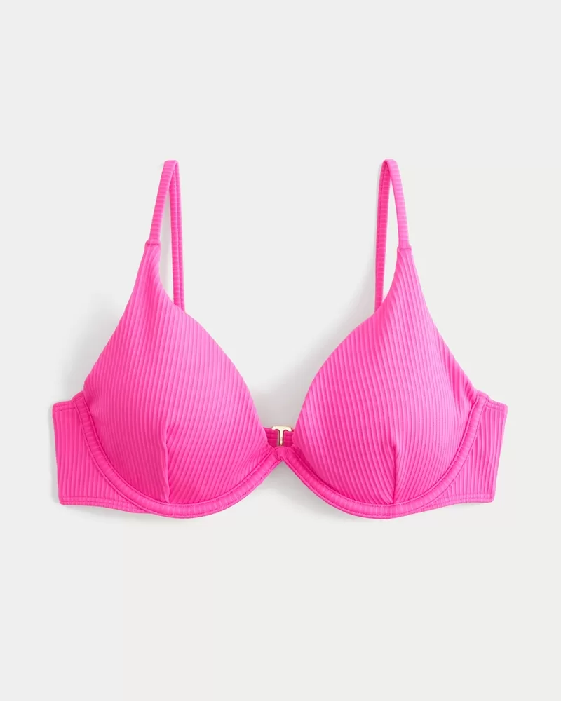 This cute bikini top is made with soft ribbed swim fabric and features underwire, removable pads and skinny straps. Swan hook closure, plunge silhouette. Imported.