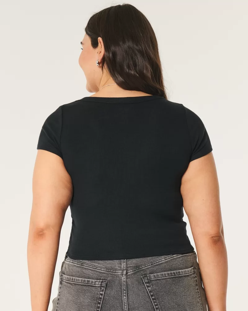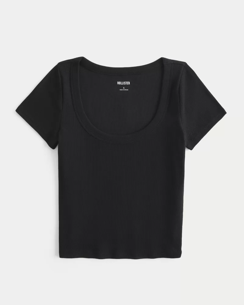 Cute and super soft, this top features a scoop neckline and ribbed fabric. Short sleeves. Slim Fit.