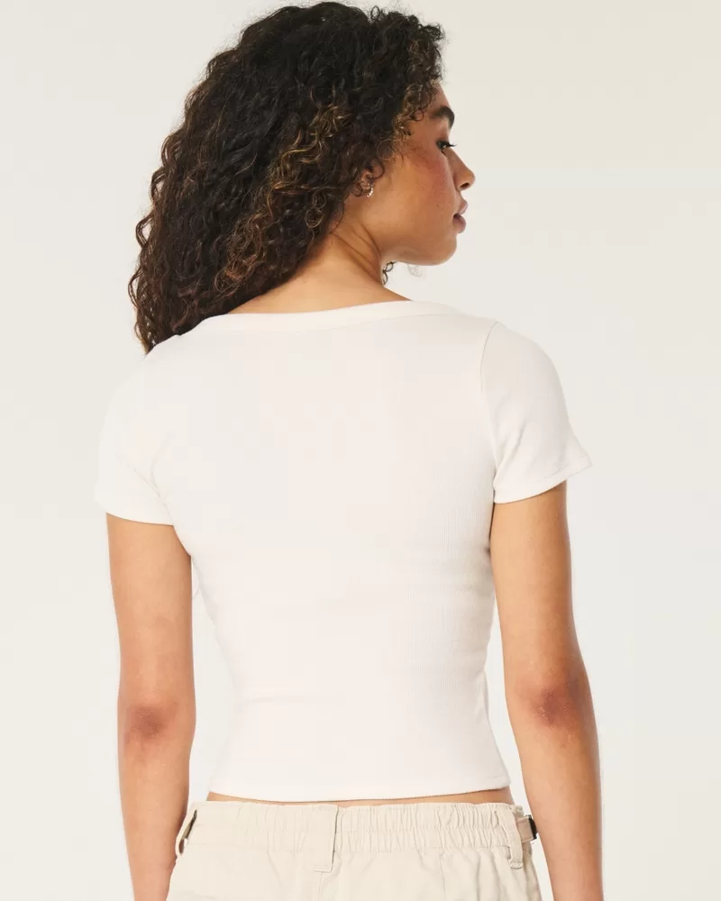 Cute and super soft, this top features a scoop neckline and ribbed fabric. Short sleeves. Slim Fit.