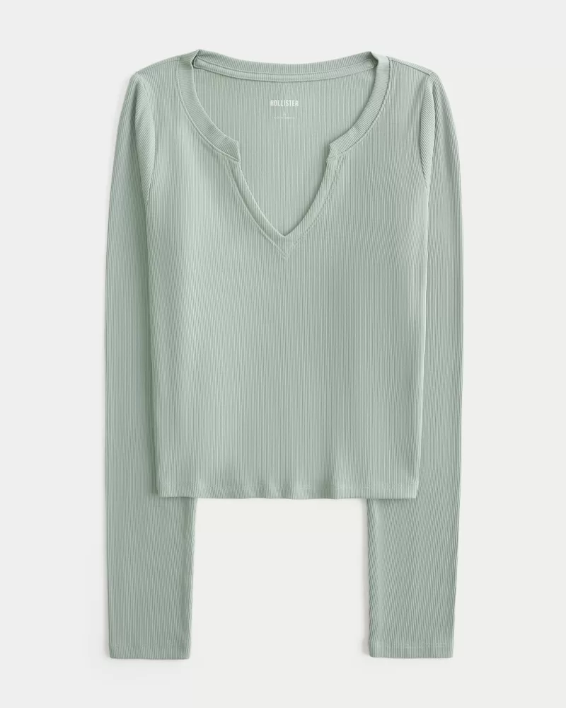 A cute and comfy top in super soft ribbed fabric with a seamless look and feel. Notch neckline, long sleeves. Slim Fit.
