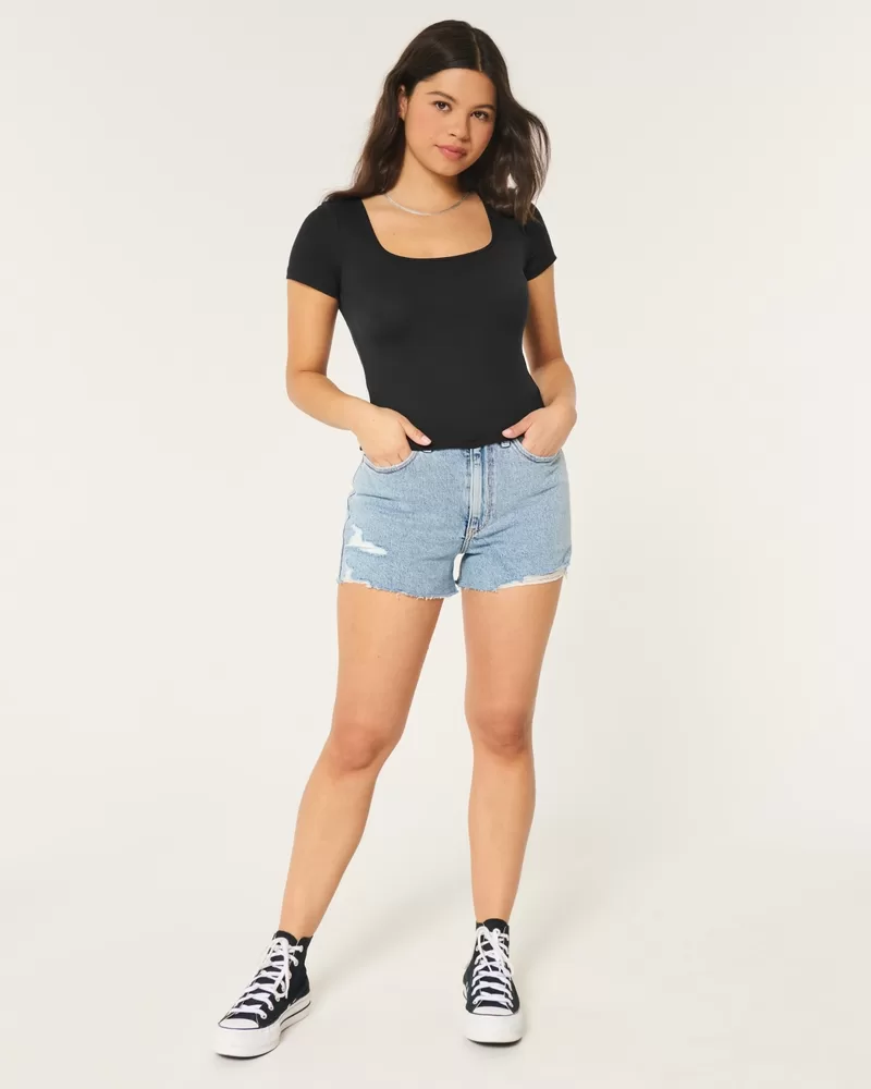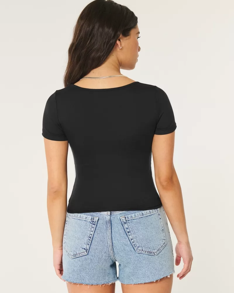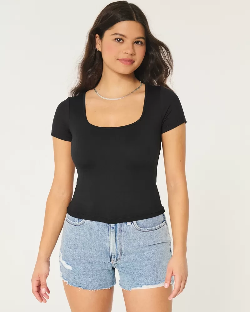 This comfy baby tee is made with super soft fabric with a seamless look and feel. Square neckline, short sleeves. Slim Fit.