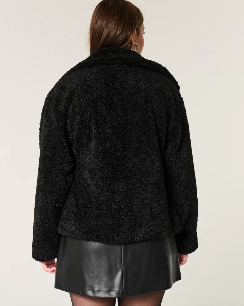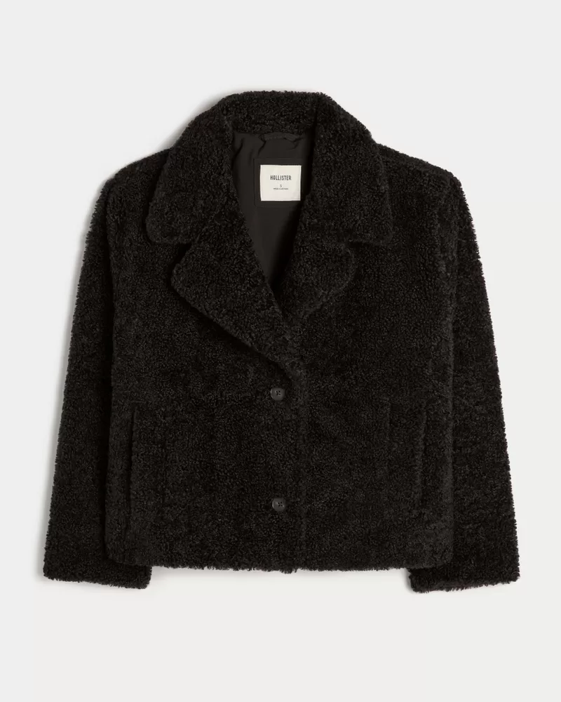 This cute and cozy peacoat features a super soft sherpa exterior and button closure. Collar, front pockets, interior pocket, fully lined.