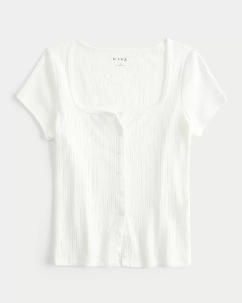 This cute and comfy top is made with super soft pointelle fabric. Button-through closure, short sleeves, square neckline. Slim Fit.