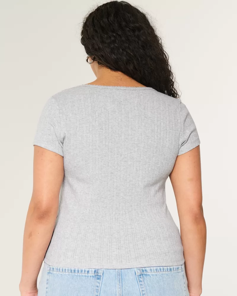 This cute and comfy top is made with super soft pointelle fabric. Button-through closure, short sleeves, square neckline. Slim Fit.