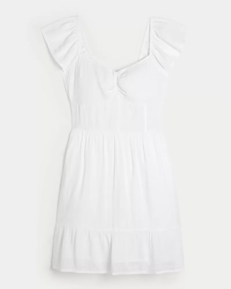 A cute and comfy skort dress with a tiered skirt and short flutter sleeves. This dress features a cinch detail at the bust, built-in hidden, bathroom-friendly knit shorts with pockets and a relaxed neckline that can be worn on or off the shoulder.