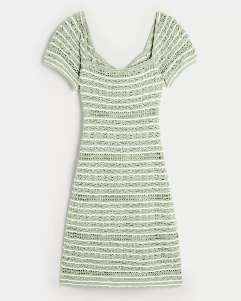 A super cute mini-length dress featuring all-over crochet-style texture and a twist back detail. Short sleeves.