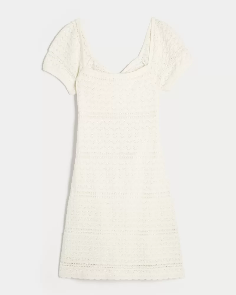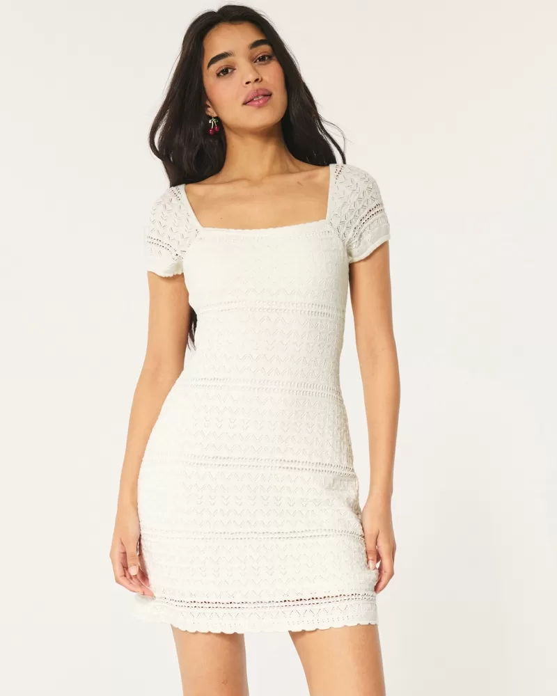 A super cute mini-length dress featuring all-over crochet-style texture and a twist back detail. Short sleeves.