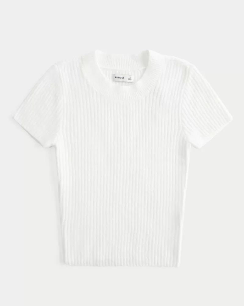 A cute and cozy sweater with short sleeves and super soft ribbed texture. Crew neckline. Slim Fit.