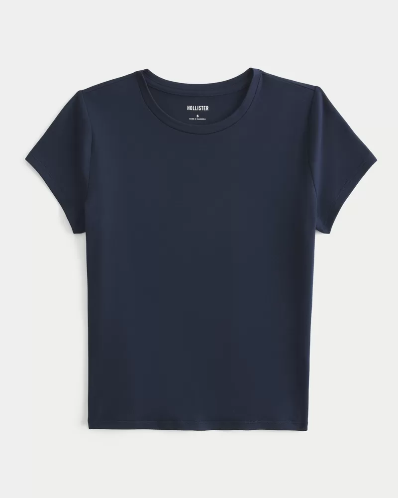 This cute and comfy baby tee is made with soft stretch fabric with a seamless look and feel. Longline silhouette, crew neckline, short sleeves.