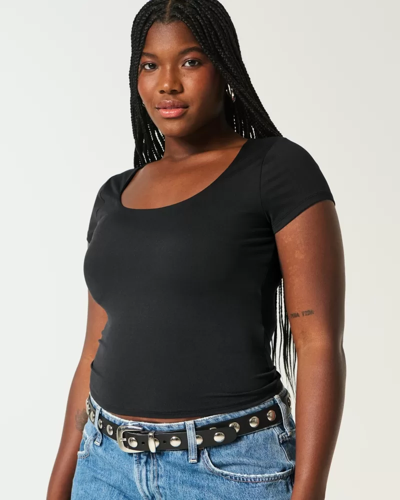 This cozy top is made with soft stretch fabric with a seamless look and feel. Short sleeves, scoop neckline, and a built-in shelf bra. Slim Fit.