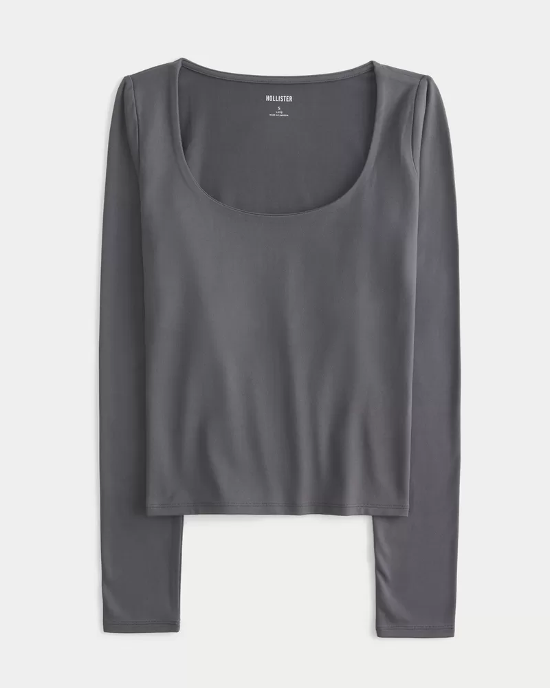 Cute and comfy, this long-sleeve top is made with soft stretch fabric with a seamless look and feel. Scoop neckline, built-in shelf bra. Slim Fit.