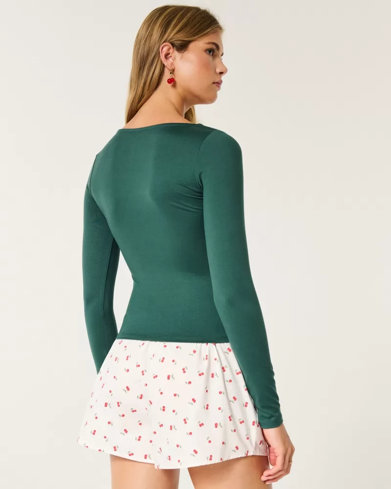 Cute and comfy, this long-sleeve top is made with soft stretch fabric with a seamless look and feel. Scoop neckline, built-in shelf bra. Slim Fit.