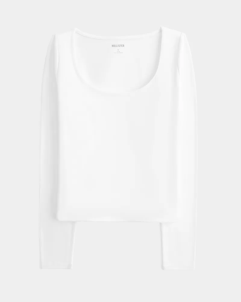 Cute and comfy, this long-sleeve top is made with soft stretch fabric with a seamless look and feel. Scoop neckline, built-in shelf bra. Slim Fit.
