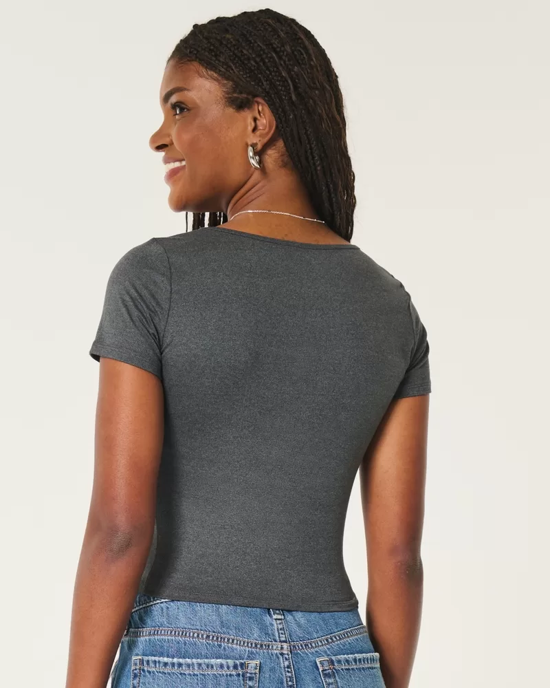 A cute and cozy baby tee in soft stretch fabric with a seamless look and feel. Designed with a slightly shrunken silhouette, square neckline and short sleeves. Slim Fit. Imported.