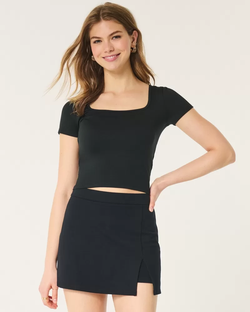 A comfy baby tee in soft stretch fabric made with a seamless look and feel. Square neckline, short sleeves. Slim Fit.